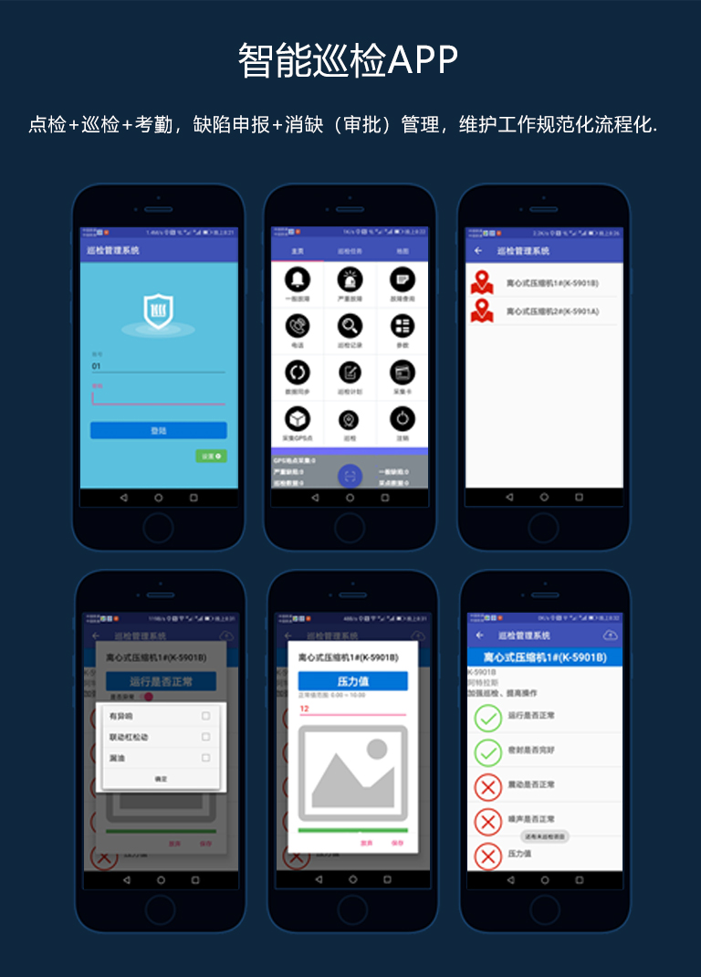 点检+巡检+考勤,缺陷申报+消缺(审批)管理,维护工作规范化流程化。