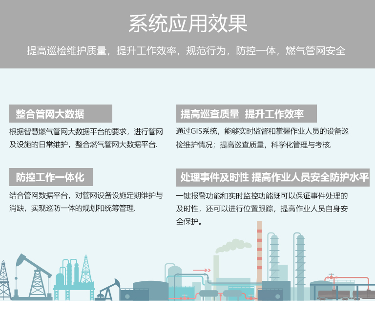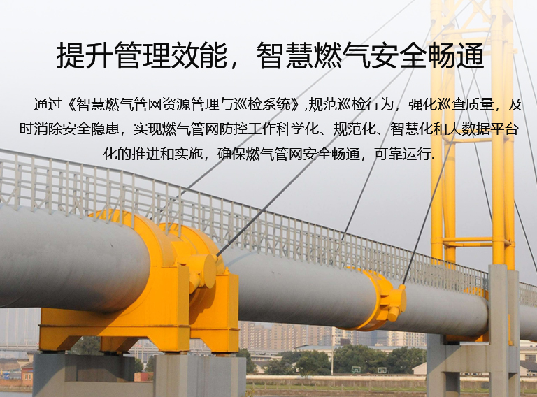 通过《智慧燃气管网资源管理与巡检系统》,规范巡回检查行为,强化巡查质量,及时消除安全隐患,实现燃气管网防控工作科学化、规范化、智慧化和大数据平台化的推进和实施,确保燃气管网安全畅通,可靠运行。
