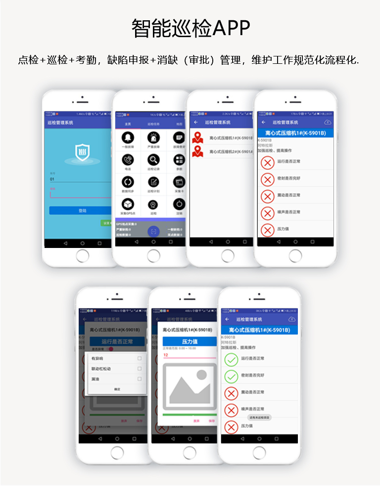 点检+巡检+考勤,缺陷申报+消缺(审批)管理,维护工作规范化流程化。